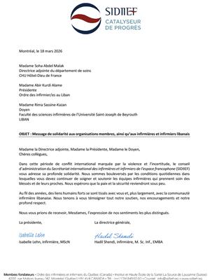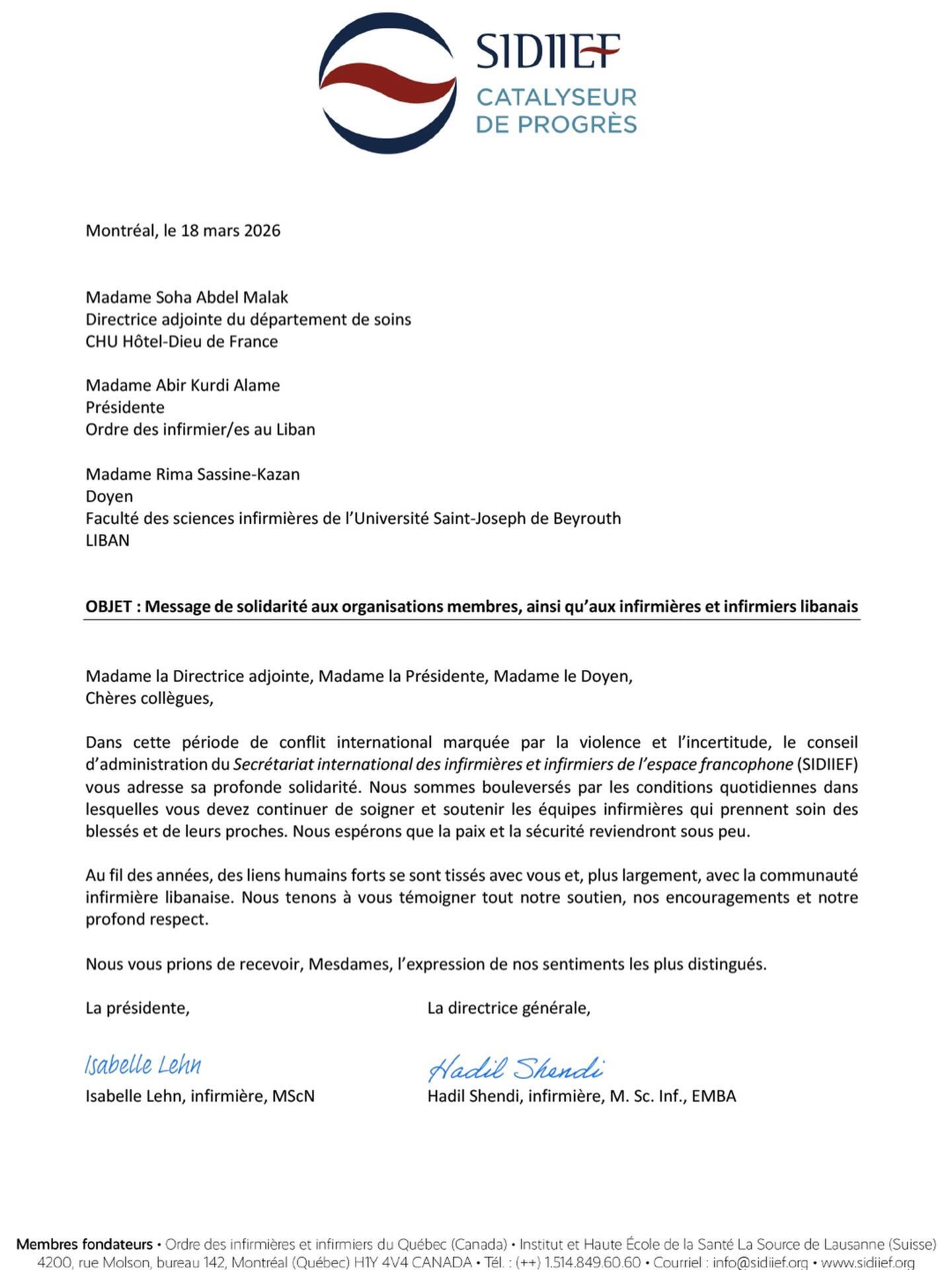 pour votre message de solidarité aux organisations membres, ainsi qu’aux infirmières et infirmiers Libanais